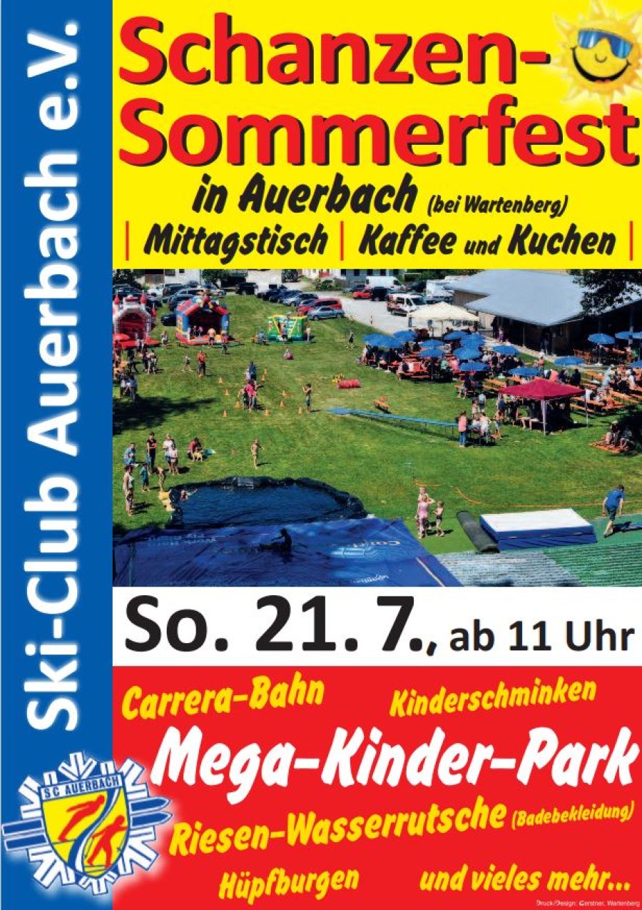 Wir laden alle herzlich ein zu unserem großen und traditionellen Sommerfest! Für Klein und Groß ist vieles geboten: unzählige Spielstationen, Kinderschminken, Hüpfburgen, Carrerabahn und die legendäre Wasserrutsche von der Schanze. Packt also Eure Badesachen mit ein. Fürs leibliche Wohl ist auch bestens gesorgt: Kulinarisches vom Grill, Steckerlfisch (so lange der Vorrat reicht), frische Kartoffelchips bis hin zu Kuchen und Torten. Wir freuen uns SEHR auf alle Besucher!